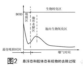 被吸附在活性污泥微生物細胞表面的有機污染物,在透膜酶的作用下,溶解態和小分子有機物直接透過細胞壁進入細胞體內,而膠體態和懸浮態的大分子有機物如淀粉、蛋白質等則先在細胞外酶一水解酶的作用 下,被水解為溶解態小分子后再進入細胞體內,此時水解產生的部分溶解性簡單有機物會擴散到混合液中,造成混合液BOD值升高,如圖2中胞外水解區曲線所示。