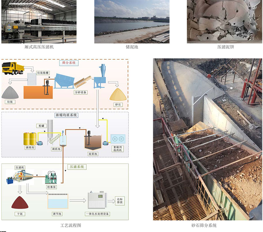 中山黑臭水體整治工程,需整治 58 條河涌,處理底泥 200 萬方。現場使用 3 臺廂式高壓壓濾機 XMYZD2000-600m2