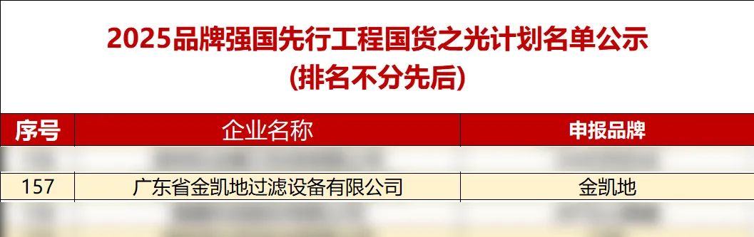 2025年1月,在“品牌強(qiáng)國先行工程”的嚴(yán)苛篩選中,廣東省金凱地過濾設(shè)備有限公司從申報企業(yè)中脫穎而出,榮登“國貨之光計(jì)劃”權(quán)威名單!這一由國家工業(yè)和信息化部指導(dǎo)、《中國工業(yè)報》聯(lián)合權(quán)威機(jī)構(gòu)評定的榮譽(yù),僅授予200家代表新質(zhì)生產(chǎn)力與高質(zhì)量發(fā)展的民族品牌。金凱地憑借技術(shù)硬實(shí)力與行業(yè)影響力成功入選,彰顯中國高端裝備制造的全球競爭力。