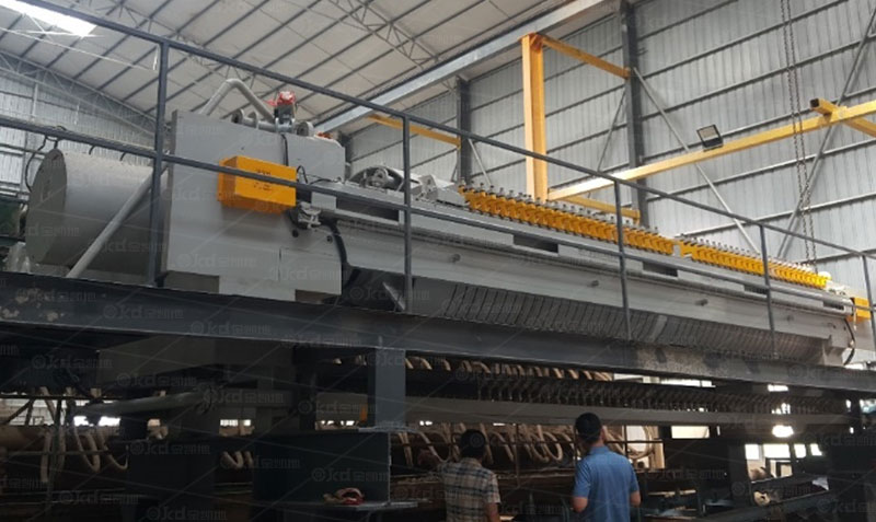 在濾板卸料過程中,部分濾餅經(jīng)常落入拉板小車導(dǎo)軌,影響拉板機(jī)構(gòu)和傳動鏈條的潤滑。自動隔膜壓濾機(jī)每運(yùn)轉(zhuǎn) 3-6個月,將兩側(cè)的鏈條蓋板打開,清理里面的污垢、油脂;同時,將鏈條拆下清洗、更換油脂。
